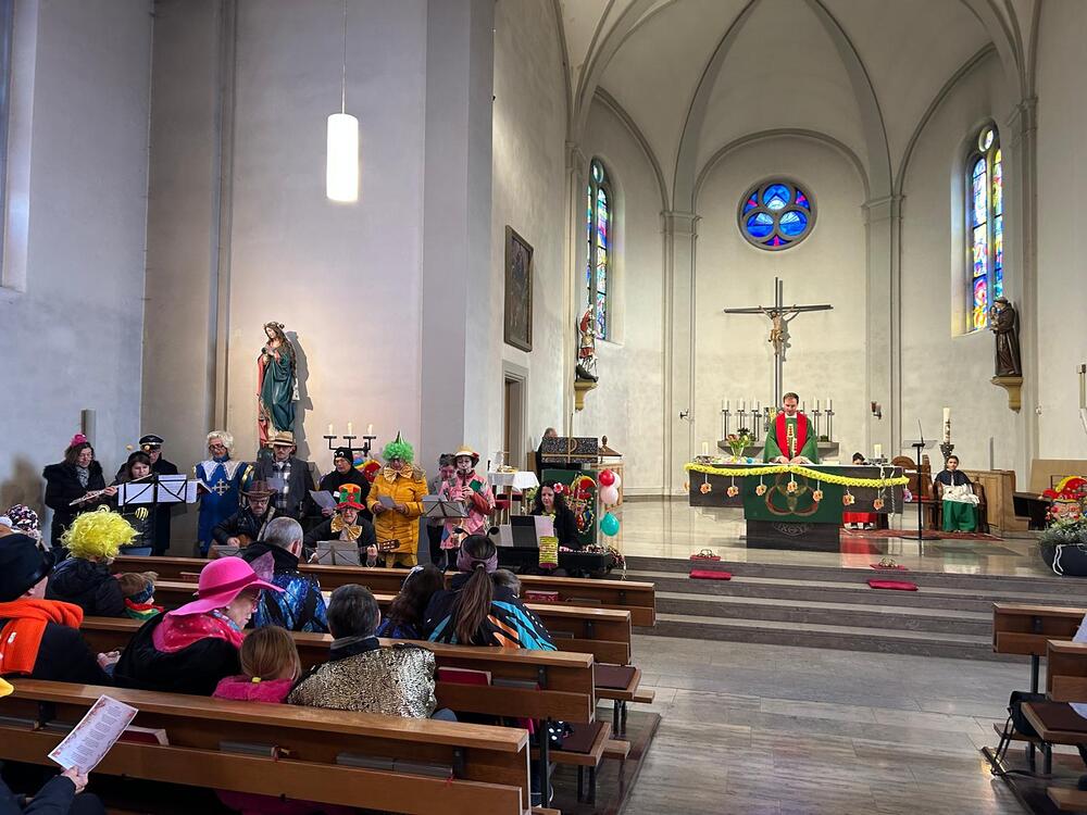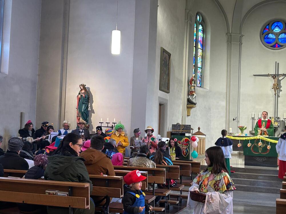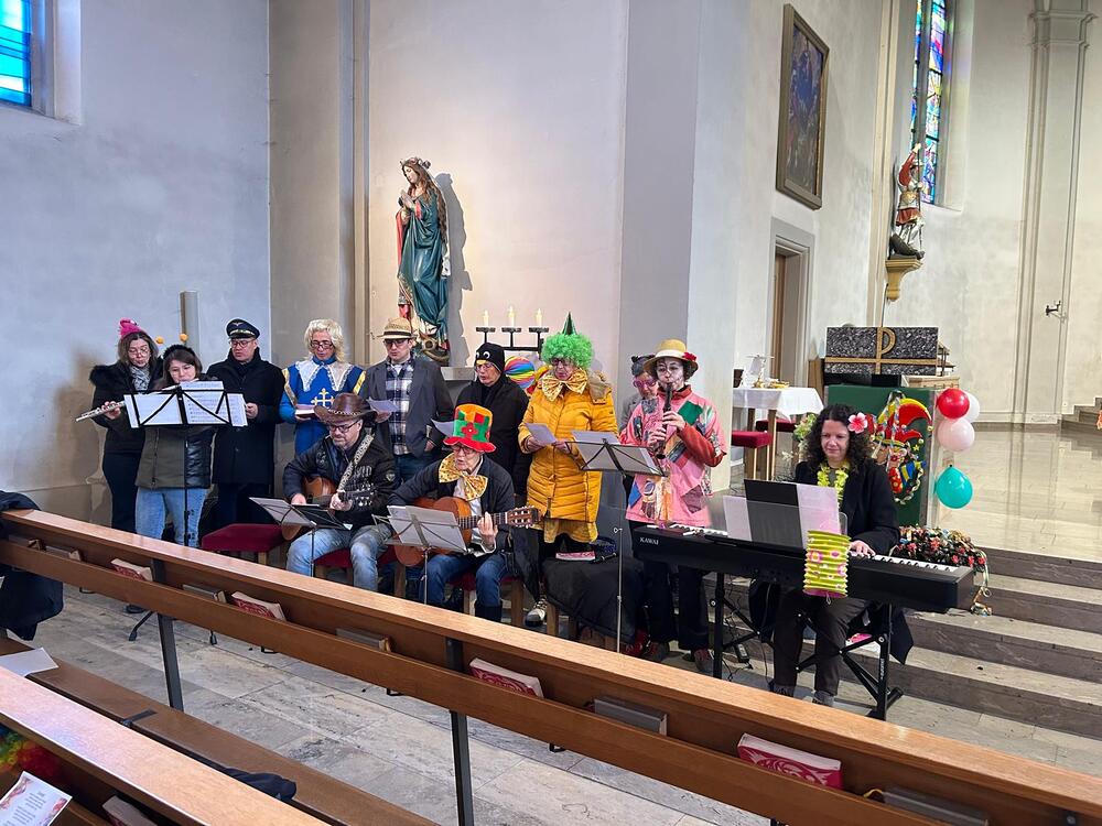 So präsentierte sich auch am Faschingssonntag unsere Pfarrkirche: geschmückt mit Girlanden, Luftballons und Clowns! Die Lieder und Texte waren humorvoll, zeigten Lebensfreude und Gemeinschaft.