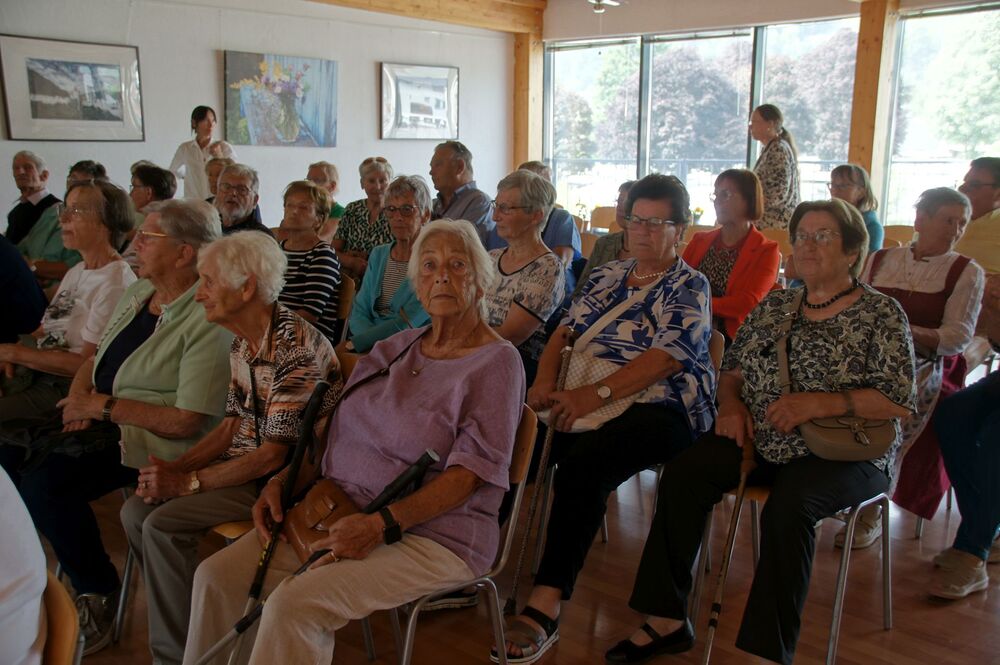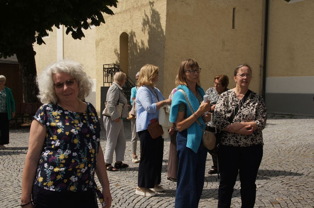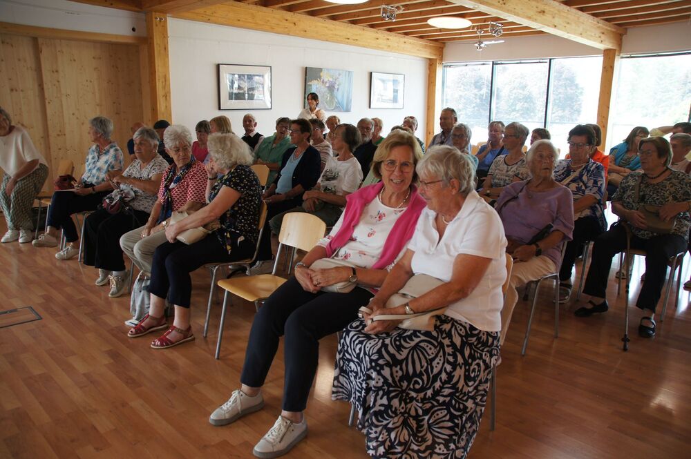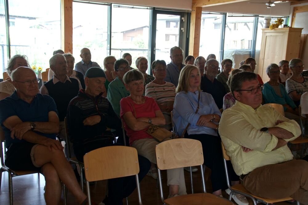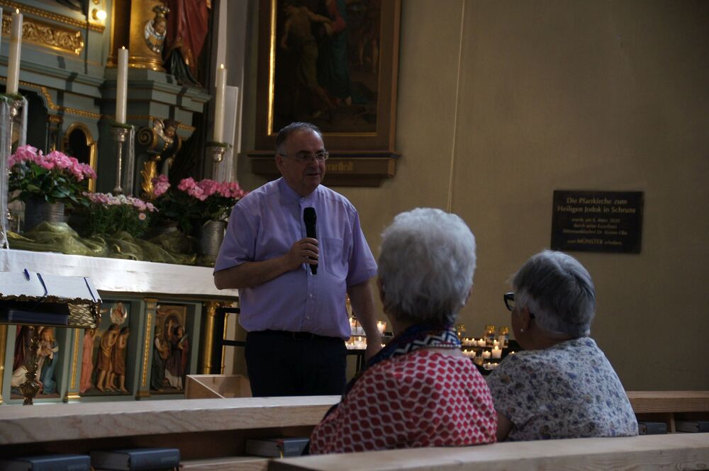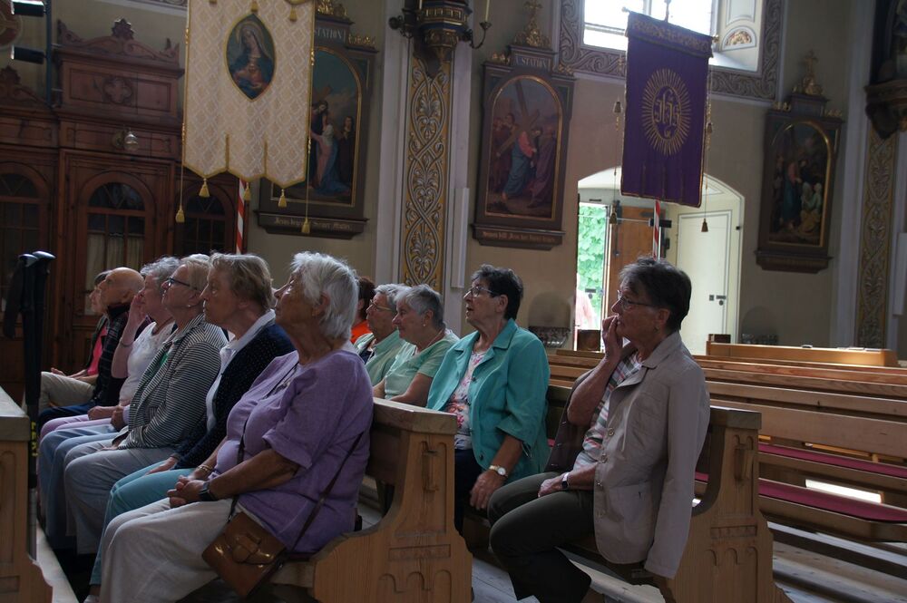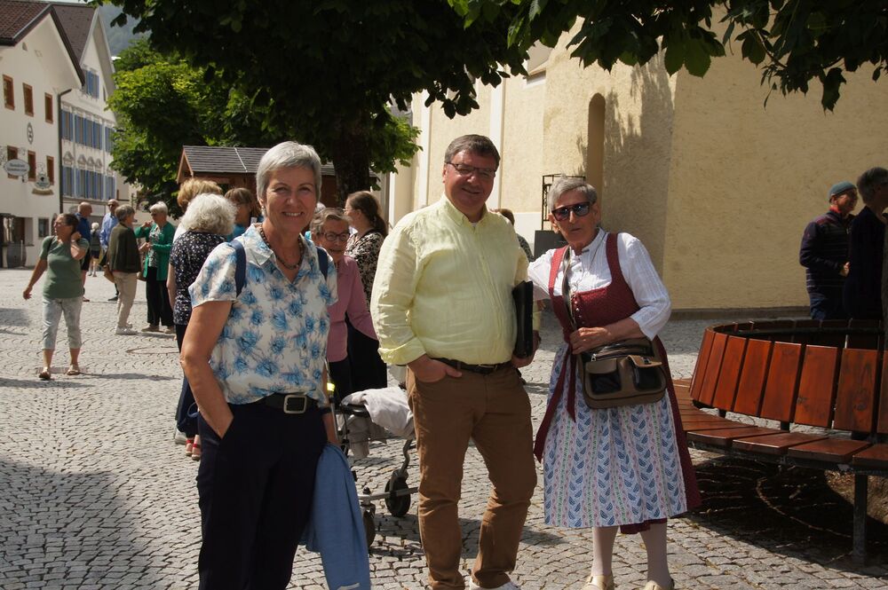 Für die Andacht wählte Pfarrer Cristinel das Thema „Dankbar für das Leben“ und Dankbarkeit war auch die Grundstimmung bei diesem Ausflug (auch wenn Wehmut und Abschiedsschmerz spürbar dabei waren). Mit den wohlüberlegten Worten und Zitaten aus der Bibel wurden außerdem die Gemeinschaft gewürdigt, positive Erinnerungen wachgerufen und die Hoffnung auf Frieden gestärkt. Danach erklärte uns Pfarrer Tinkhauser, wie er es schaffte, dass aus der Schrunser Pfarrkirche das einzige Münster Vorarlbergs wurde.